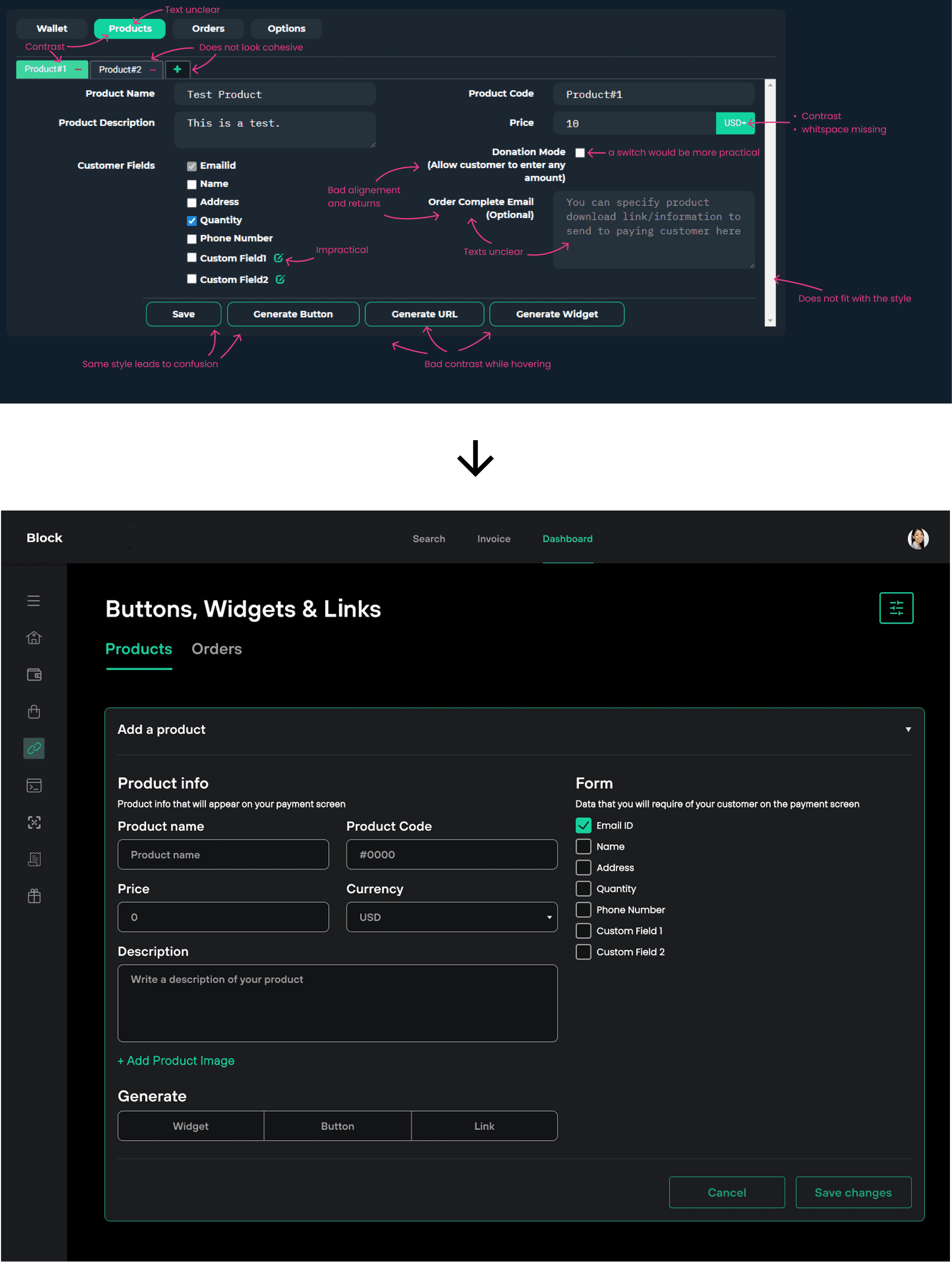 I was tasked to redesign, reorganize and prepare a design system for a B2B platform that integrates as a plugin into a variety of e-commerces, giving the user the ability to receive Bitcoin payments. The platform had a dashboard section, a wallet search function and an invoice generator.